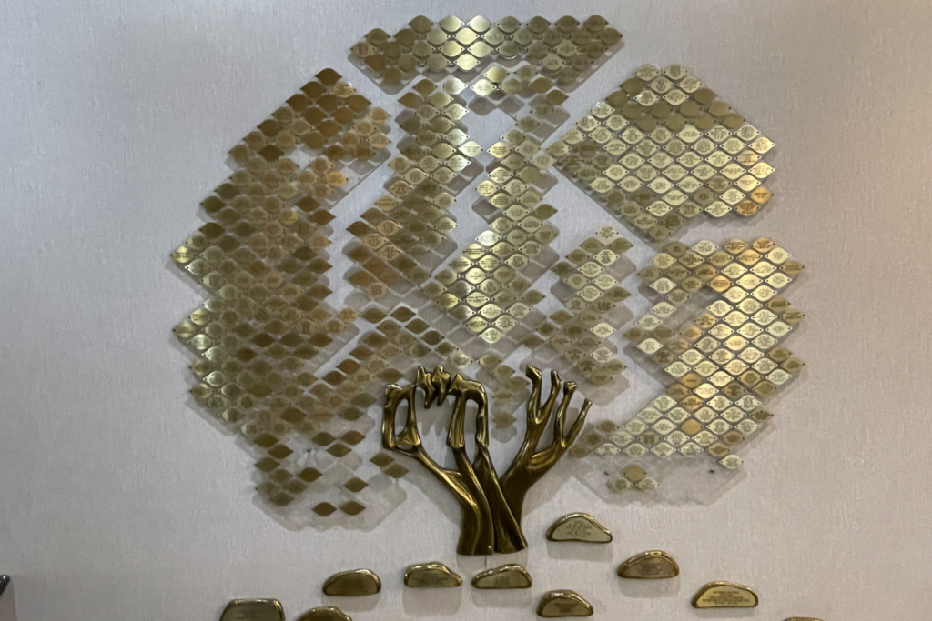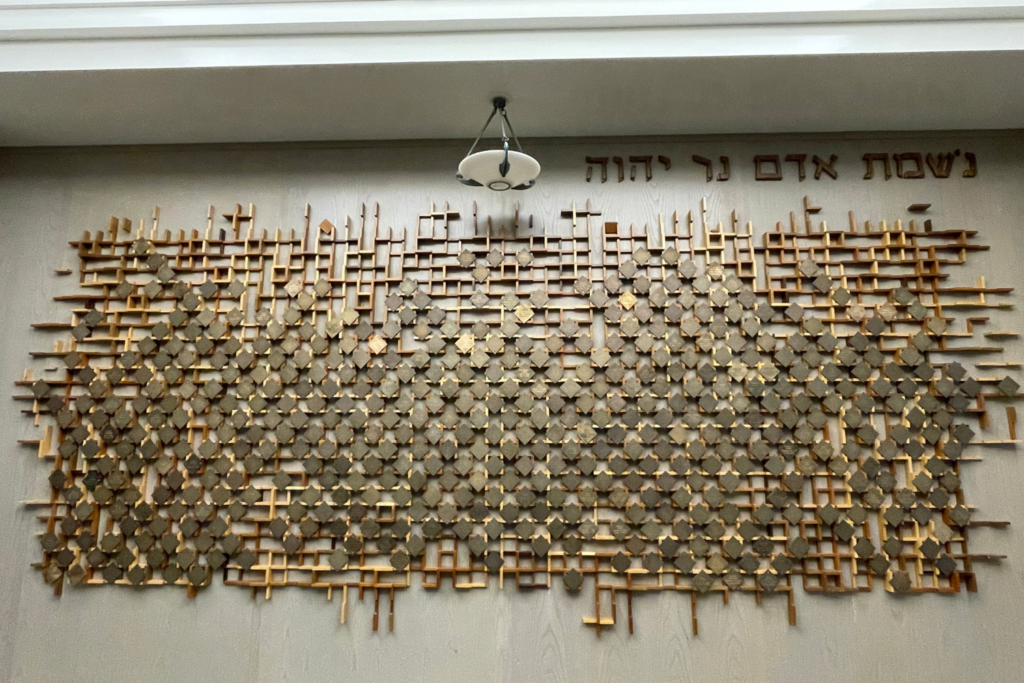 The Wall of Remembrance, located outside the Zwerin Sanctuary, is a way to memorialize the passing of a loved one. Nameplates are inscribed with the name of the departed along with the English and Hebrew date of death.